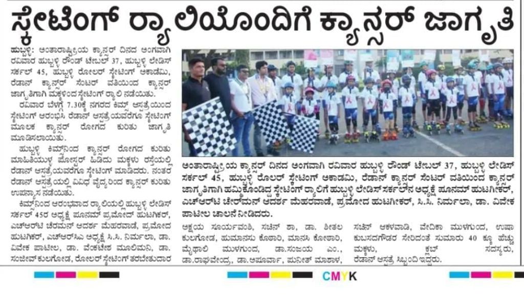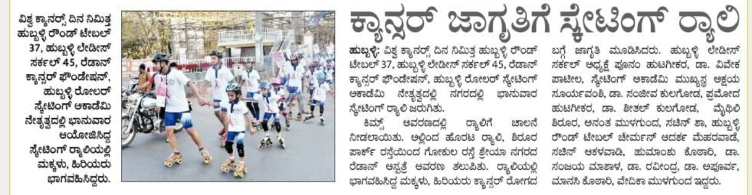 On the occasion of International Cancer Day, a skating rally was organized from Kim's Hospital to Radon cancer hospital for creating awareness among the general public. The rally was led by Hubballi Round Table 37, Hubballi Ladies Circle 45, Hubballi Roller Skating Academy, and Radon Cancer Centre.